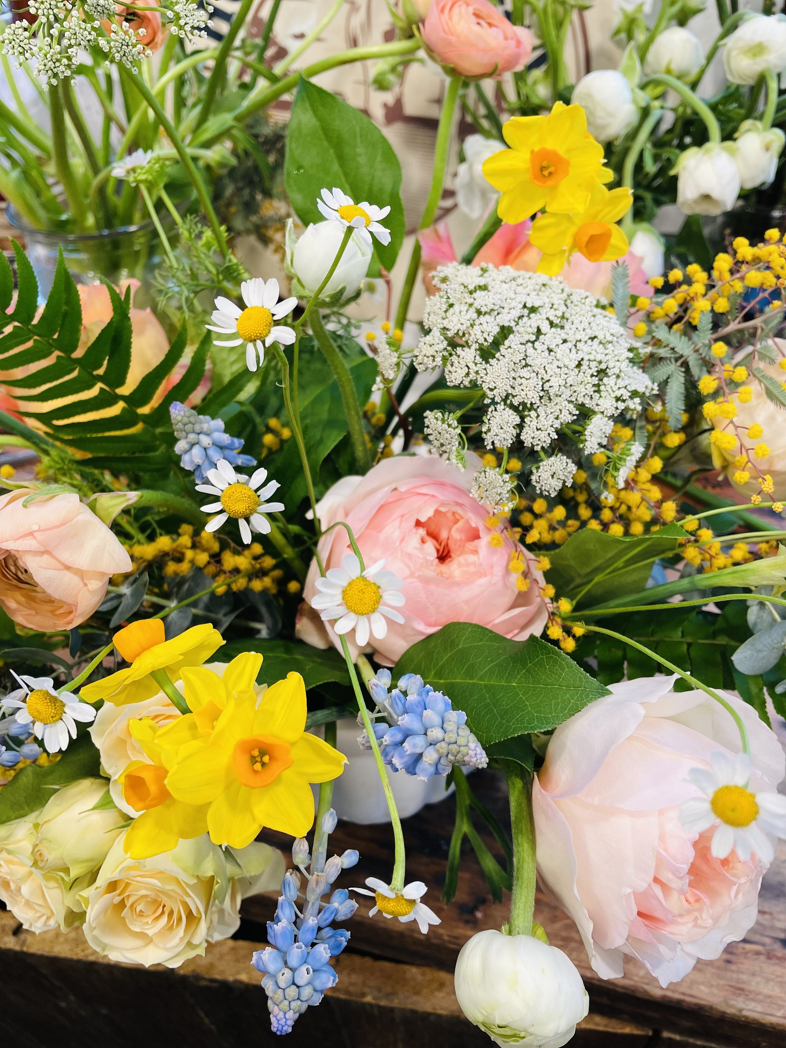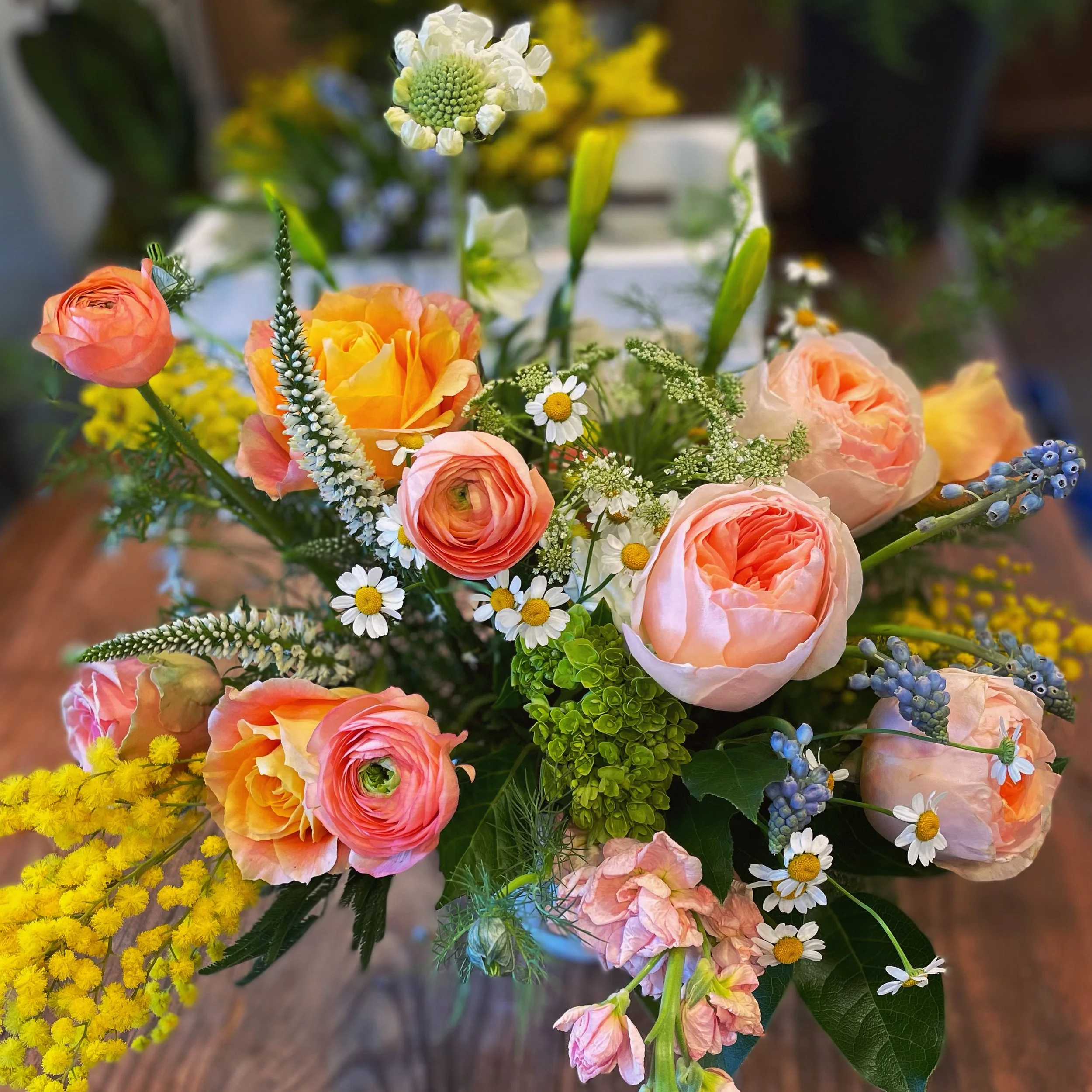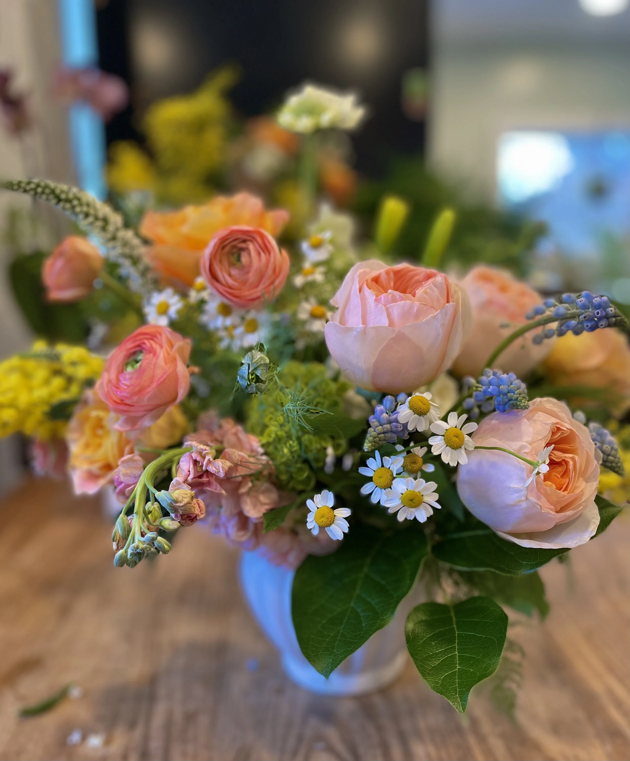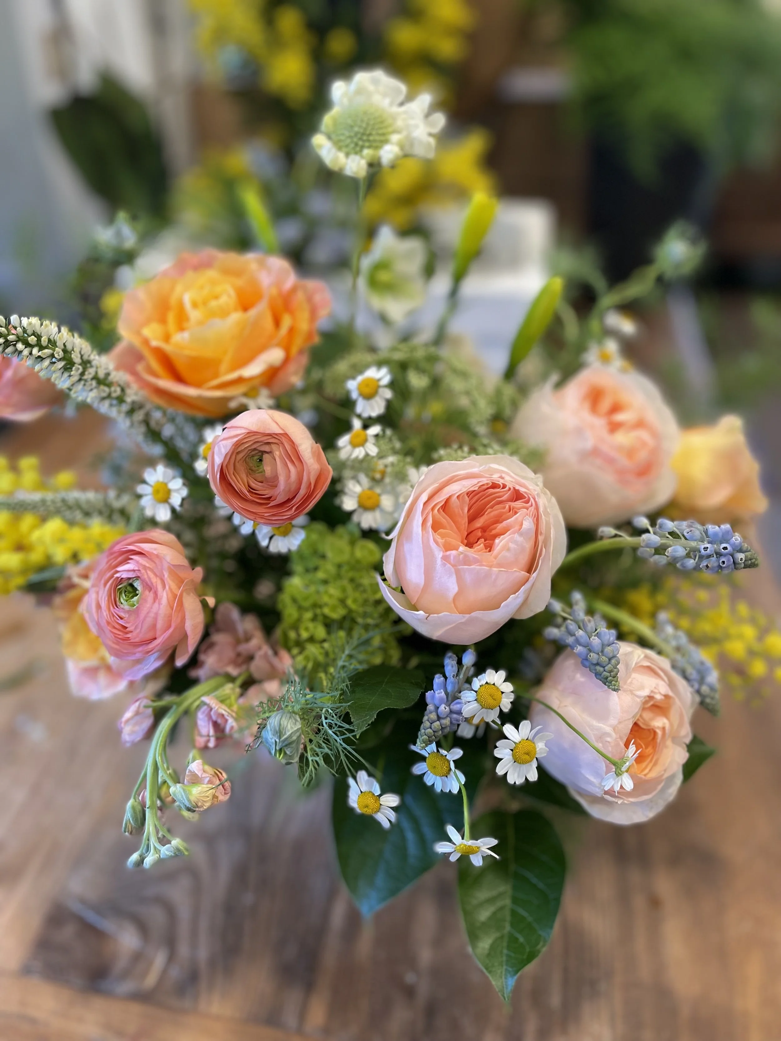All of Spring’s finest blooms come together. Peach garden roses, ranunculus, hyacinth, tulips plus daffodils, hydrangea and more! This is a deluxe collection measuring approximately 14 inches across and 10 inches high. Perfect for Valentine’s Day or any day!